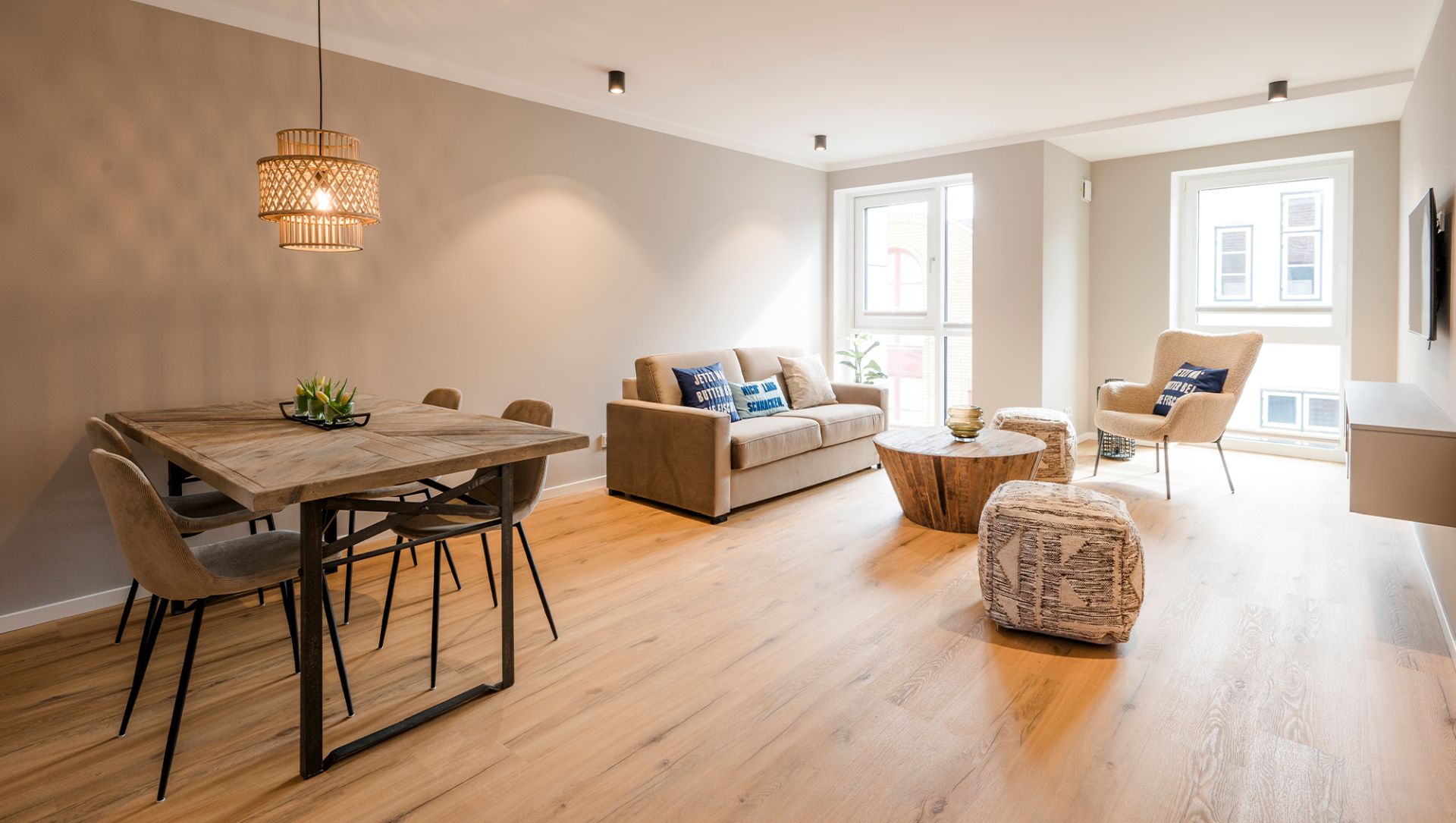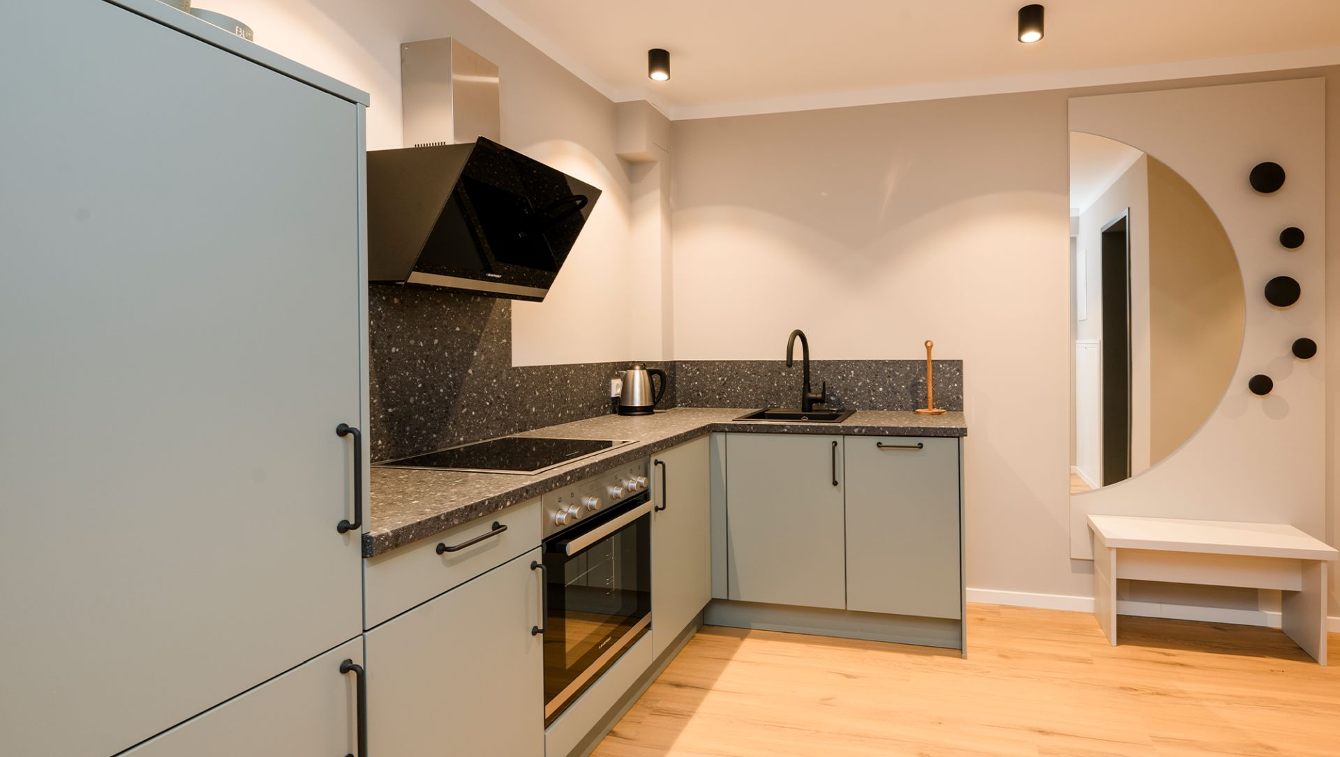 - Kitchen with fridge incl. freezer compartment, stove, oven, dishwasher (tabs included), coffee machine, kettle, cutlery, dishes, pots & pans