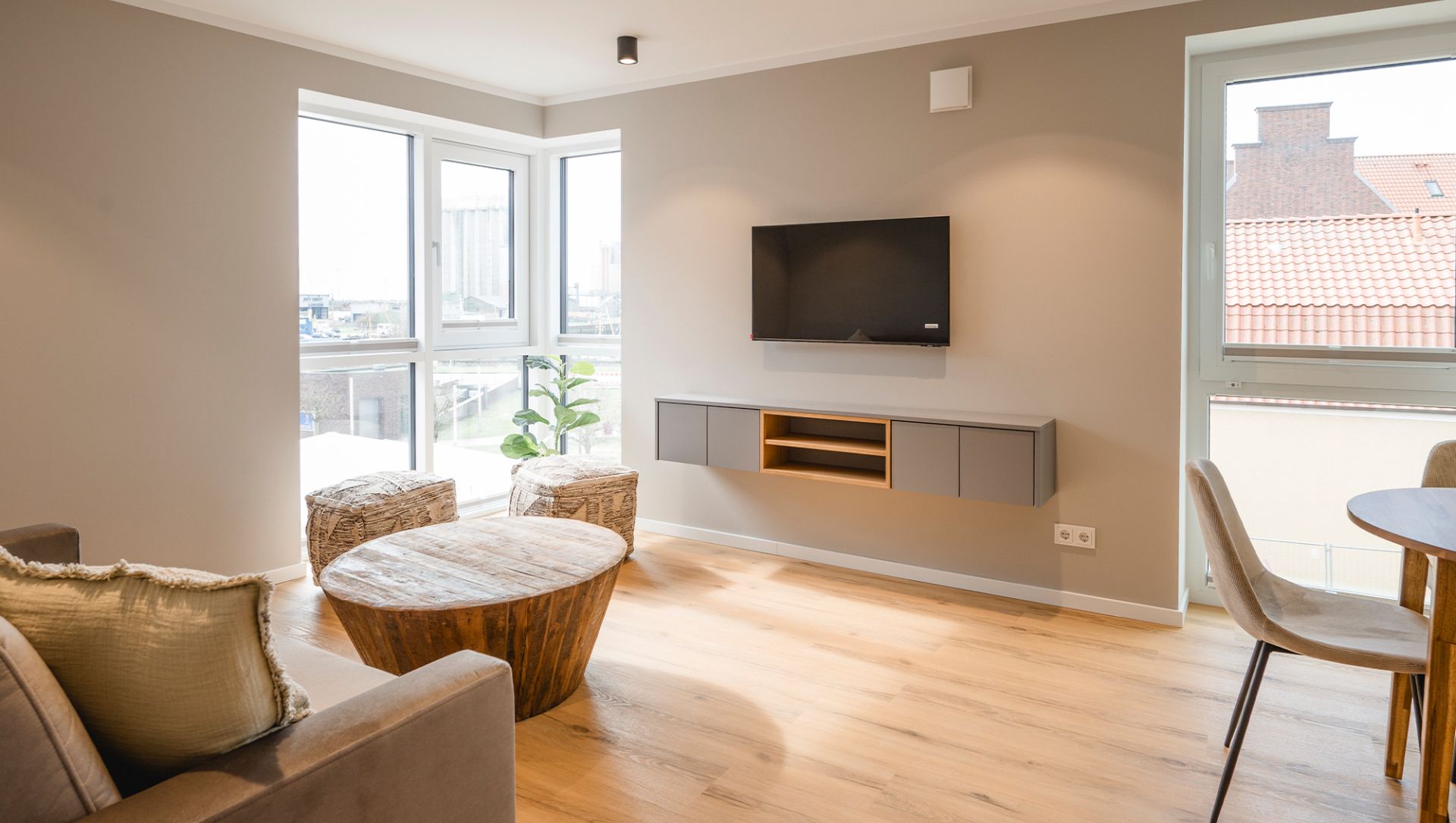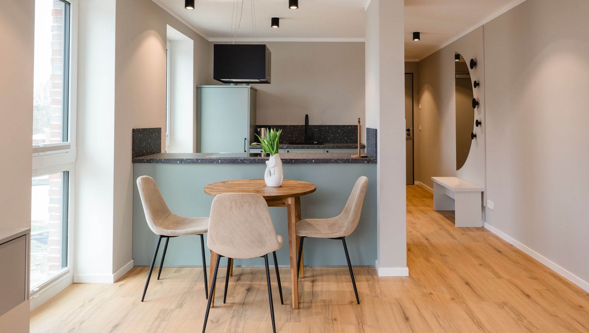 - Kitchen with fridge incl. freezer compartment, stove, oven, dishwasher (tabs included), coffee machine, kettle, cutlery, dishes, pots & pans